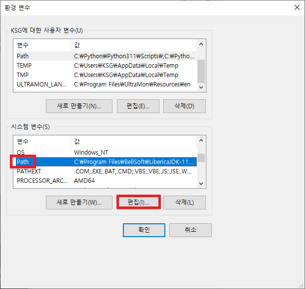 3.1. 앞서 환경 변수 창에서 PATH 변수를 찾아 "편집" 버튼을 누릅니다.