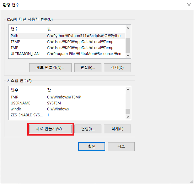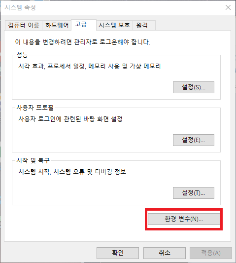 2.3. 환경 변수 버튼을 눌러 새로운 시스템 변수를 추가합니다.